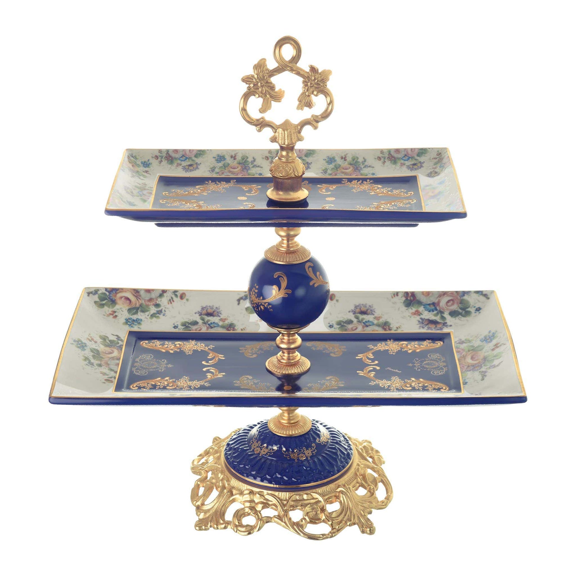 Caroline - Rectangular Stand 2 Tiers with Base - Floral Design - Blue & Gold - 43cm